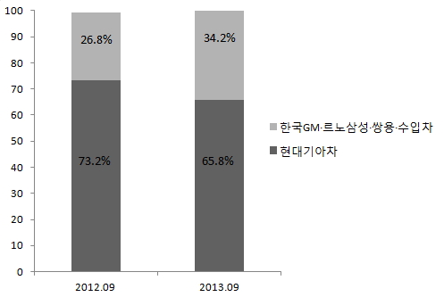 이에 현대기아차의 내수 시장 점유율은 65.8%까지 떨어졌다. 현대기아차는 지난달 내수 판매 부진으로 점유율이 69.3%로 낮아져 지난 2008년 9월(66.3%) 이후 가장 저조한 내수 점유율을 기록했는데, 이번달에는 이보다 3.5%가 더 하락했다. 게다가 73.2%를 기록했던 지난 2012년 9월과 비교해 불과 1년 사이에 7.4%나 떨어진 것이다.