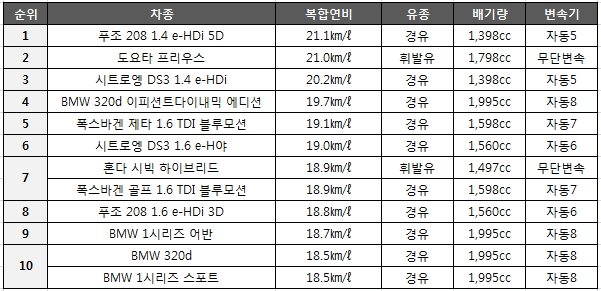 다음은 국내에 판매되는 자동차 중 연비가 가장 좋은 차 TOP10이다(자동변속기 기준).