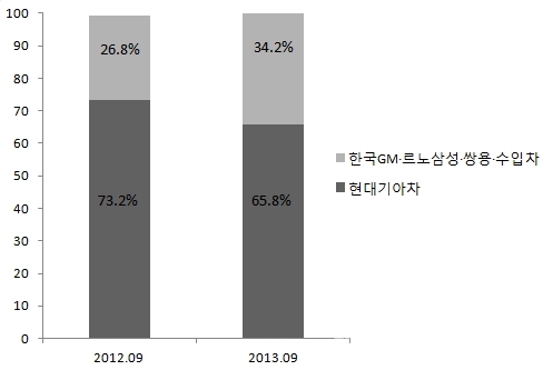 현대기아차 지난 9월 내수 시장 점유율은 65.8%로, 지난 2102년 9월(73.2%)와 비교해 1년 사이 7.4%가 줄어들었다. 현대기아차 측은 경기 침체와 노조 파업, 추석 연휴로 인한 근무일 부족 등을 이유로 내세웠지만 상황은 생각보다 더욱 심각하다는 것이 업계 관계자들의 중론이다.