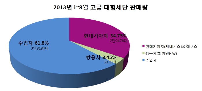 가장 큰 위협은 급증하는 수입차다. 작년에 겨우 10%를 넘겼던 수입차 점유율은 올해 들어 12%대까지 늘었고, 특히, 현대차 제네시스·에쿠스, 기아차 K9 등이 경쟁하는 고급 세단 시장에선 이미 61.8%의 점유율을 기록하고 있다.