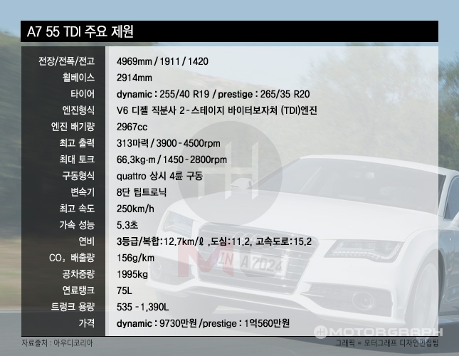 'A7 55 TDI 콰트로'는 V6 3,000cc 엔진에 '2-스테이지 바이터보(Bi-turbo)'를 결합한 TDI 디젤 엔진 모델이다.