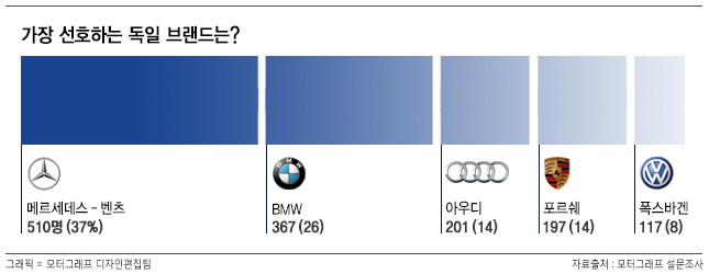 총 1392명이 응답한 이번 조사에서 메르세데스-벤츠는 510명(37%)의 지지를 받아 가장 선호하는 독일 브랜드로 선정됐다. 다음으로는 BMW가 367명(26%)로 2위에 올랐으며, 아우디는 201명(14%)로 3위를 기록했다. 포르쉐는 197명(14%)로 폭스바겐(117명, 8%)를 누르고 4위에 이름을 올렸다.