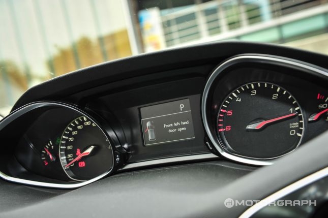계기반의 위치는 처음엔 다소 난감하게 느껴진다. 대개 스티어링휠 사이로 계기반을 확인하는데, 308은 아예 스티어링휠 위로 계기반을 보게 돼있다. 생소하긴 하지만 전방을 주시하면서 계기를 함께 확인할 수 있는 장점은 분명하다. 또 하나 이색적인 것은 왼쪽엔 속도계, 오른쪽인 회전계가 놓였다. 또 바늘의 움직은 서로 대칭이다. 익숙한 구조는 아니지만 회전계를 또렷하게 보며 운전할 수 있다는 것은 분명 큰 재미요소다.