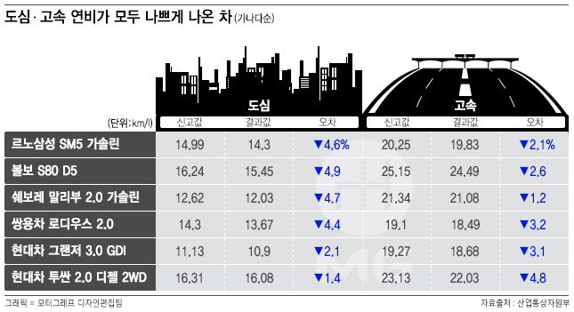또, 르노삼성 SM5 가솔린(도심 -4.6%, 고속 -2.1%)과 현대차 투싼ix(도심 -1.4%, 고속 -4.8%), 쉐보레 말리부 2.0 가솔린(도심 -4.7%, 고속 -1.2%), 현대차 그랜저 3.0 GDI(도심 -2.1, 고속 -3.1%) 나쁜 것으로 측정됐다.