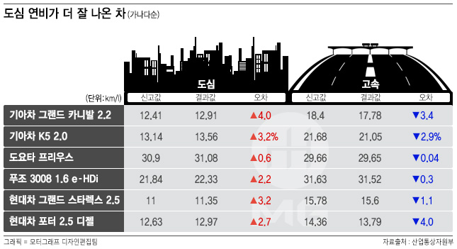 또, 현대차 포터 2.5 디젤은 도심에서는 2.7% 좋고 고속에서는 4.0% 나빴다. 푸조 3008 1.6 e-HDi는 도심 2.2%, 고속 -0.3%로 나타났다.