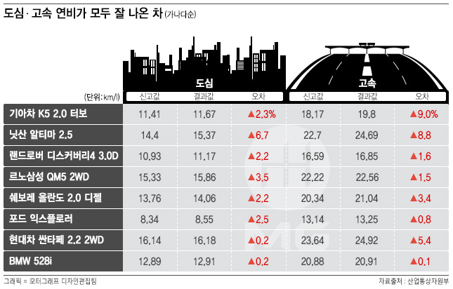 이밖에 랜드로버 디스커버리4 3.0D(도심 2.2%, 고속 1.6%), 포드 익스플로러(도심 2.5%, 고속 0.8%), BMW 528i(도심 0.2%, 고속 0.1%)도 신고값보다 우수하게 측정됐다.
