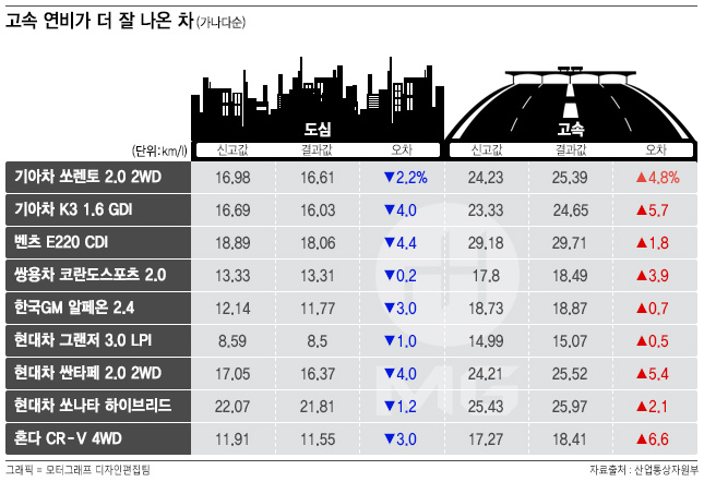 이밖에 현대차 쏘나타 하이브리드(도심 -1.2%, 고속 2.1%), 메르세데스-벤츠 E220 CDI(도심 -4.4%, 고속 1.8%), 현대차 그랜저 3.0 LPi(도심 -1.0%, 고속 0.5%), 한국GM 알페온 2.4(도심 -3.0%, 고속 0.7%) 등 도심과 달리 고속 연비가 신고치값보다 좋은 것으로 측정됐다.