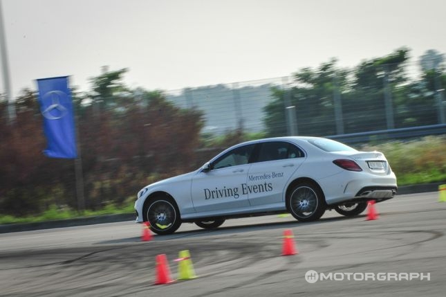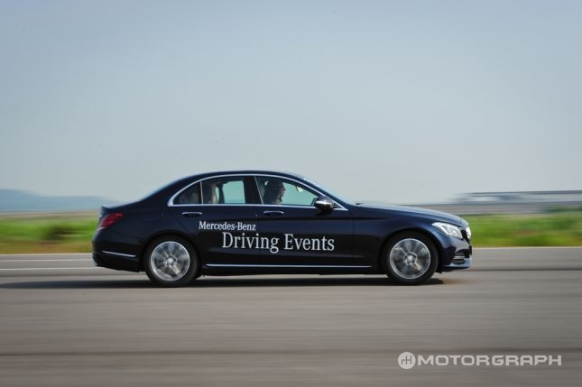 속도에 따른 스티어링휠의 무게감이나 일정한 조작에 따라 신속하게 앞머리를 돌리는 느낌은 훌륭하다. 슬라럼을 하다보면 라바콘을 지날수록 속도가 조금씩 높아지고 각도도 커지기 마련이지만 신형 C클래스는 예상보다 움직임이 더 컸다. 하지만 안전 범위를 벗어날 정도까지 가만두진 않는다. 전자장비의 개입으로 바로 중심을 잡고 안정적인 궤도를 유지할 수 있다. 전자장비의 개입이 매우 깔끔한 것도 특징이다.