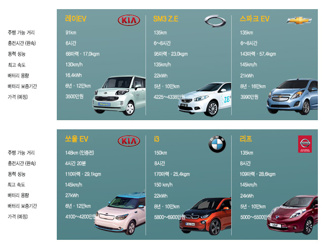 현재 국내에 출시된 전기차는 6종. 기아차 레이EV를 시작으로 쉐보레 스파크EV와 르노삼성 SM3 Z.E., 기아차 쏘울 EV 등 국산 전기차 4종과 BMW i3와 닛산 리프 등 수입 전기차 2종이 추가됐다.