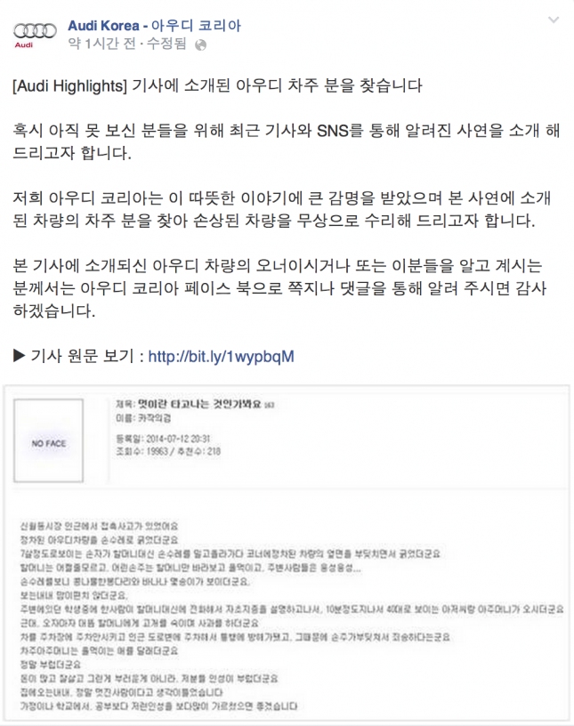 17일, 아우디코리아가 페이스북을 통해 훈훈한 감동의 주인공을 찾아나섰다.