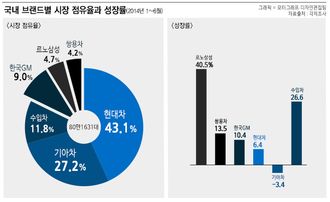 이 중 한국GM은 7만1958대를 판매해 10.4% 성장했다. 르노삼성도 40.5%나 늘어난 3만6977대를 판매했으며, 쌍용차는 3만3235대로 13.5% 증가했다. 여전히 56만5198대의 현대기아차에 비해 판매량은 턱없이 부족한 상황이지만, 내수 점유율은 각각 9.0%, 4.7%, 4.2%로 전년보다 조금씩 상승했다.