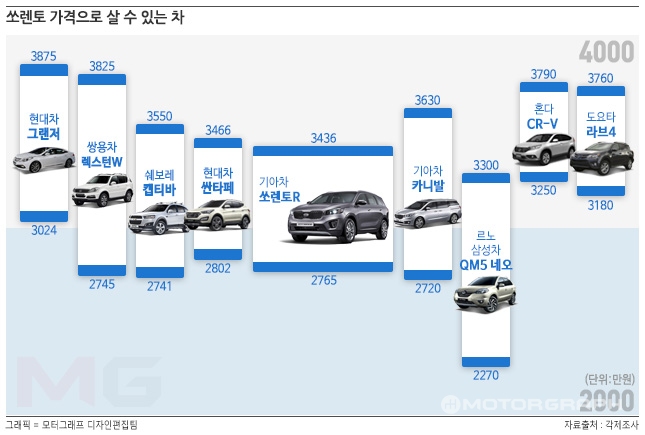 기아차 신형 쏘렌토의 판매가격으로 국내서 구입할 수 있는 차를 살펴봤다. 국산 준대형 세단부터 수입 소형차 및 SUV까지 선택의 폭은 넓었다.