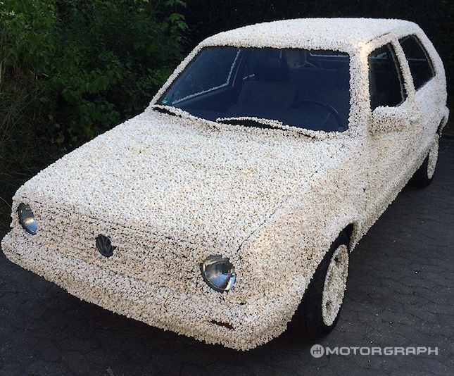 독일 브라운슈바이크 대학의 한 미대생이 톡톡 튀는 예술작품을 내놓았다. 그는 가족과 친구들의 기쁨과 아름다운 추억을 전달하기 위해 1983년형 폭스바겐 골프를 팝콘으로 덮었다고 설명했다. 그는 엠블럼과 헤드램프 및 테일램프를 제외한 모든 부분에 팝콘을 빼곡하게 붙였다.