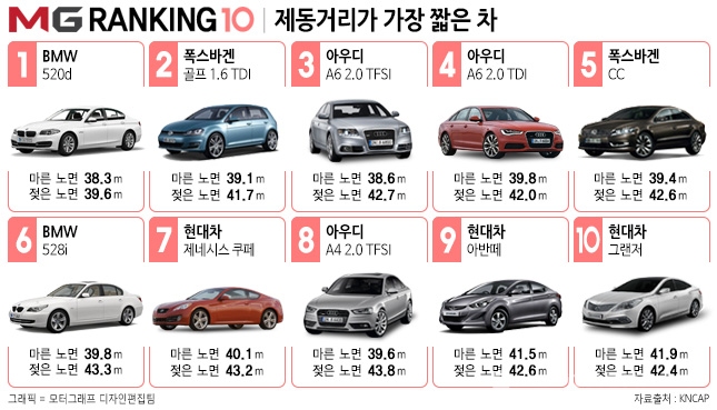 아래는 국내서 제동거리가 가장 짧은 차 목록. 마른 노면과 젖은 노면의 평균값으로 순위를 정했다. 제동거리와 관련해 자세한 사항은 자동차결함신고 센터 홈페이지를 통해 확인할 수 있다.