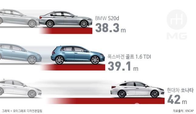 현대차가 야심차게 준비한 신형 LF 쏘나타의 경우 마른 노면에서는 42.0m, 젖은 노면에서는 46.2m의 짧지 않은 제동거리를 기록했다. 시험 차종 중 28위로 보통인데, 이전세대 경쟁 모델인 기아차 K5나, 르노삼성차 SM5에 비해도 제동거리가 길었다.