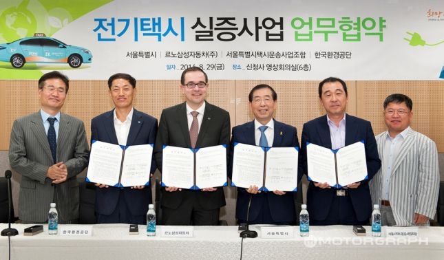 르노삼성자동차는 29일 오전 서울시청에서 박원순 서울 시장, 프랑수아 프로보 르노 삼성 대표 등 업계 관련자들이 만나 전기택시 실증사업 양해각서(MOU)를 체결했다고 설명했다.