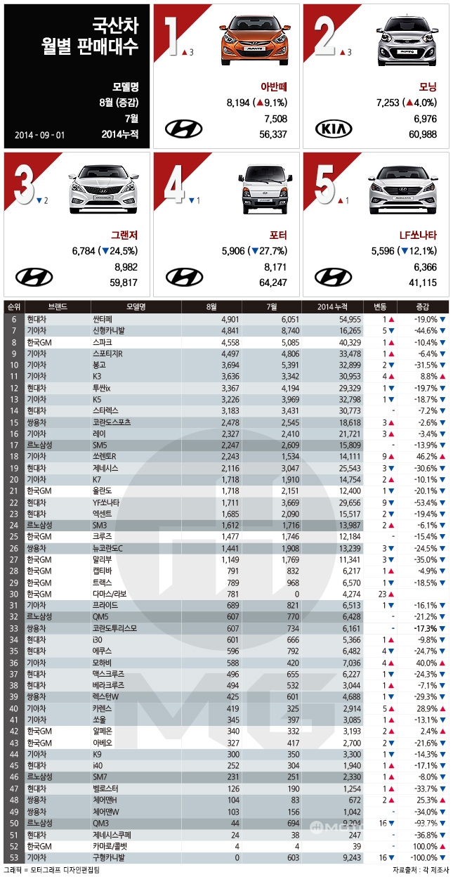 브랜드 별로 현대차 4만8143대, 기아차 3만6003대, 한국GM 1만1938대, 쌍용차 5158대, 르노삼성차 4741대가 각각 판매됐다. 지난 7월에 비해 현대차 1만1497대, 기아차 6302대, 한국GM 1369대, 쌍용차 869대, 르노삼성차 1299대 각각 판매가 감소했다.