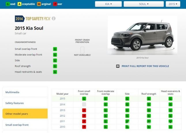 쏘울은 스몰오버랩, 일반오버랩, 사이드, 루프 내구성, 시트 및 헤드레스트 등 총 5개의 충돌테스트 조건에서 모두 최고 등급인 'G'(Good, 우수)등급을 받았다. 각 시험별 세부 항목에서도 단 한개의 'A'(Acceptable, 양호)등급을 받았을 뿐, 나머지 항목은 모두 G등급을 받았다.