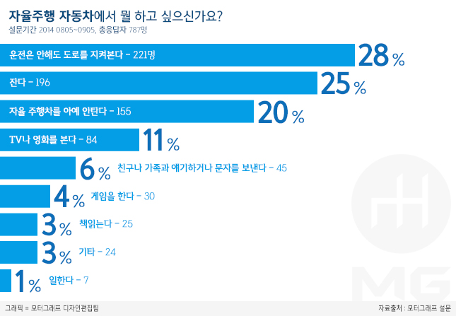 모터그래프가 8월5일부터 9월5일까지 실시한 자율주행차에 대한 설문조사에 따르면 787명의 응답자의 28%는 '자율주행을 해도 운전할때와 마찬가지로 도로를 응시할 것'이라고 밝혔다. 자율주행차를 믿지 않는다는 의미다. 이런 경우는 자율주행차가 무의미하다. 또 '자율주행 자동차를 아예 안타겠다'는 응답도 20%나 됐다.