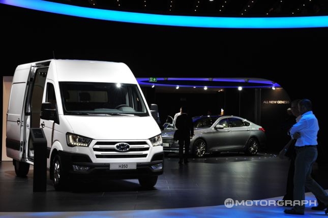 ▲ 현대차가 최초로 시도하는 대형밴 H350과 제네시스도 전시됐다. H350에도 많은 기자들이 몰렸다. 제네시스는 인기가 없었다. H350가 속한 대형밴은 알짜배기 시장이다. 현대차는 이차를 국내에도 출시할 계획을 갖고 있다. 국내 출시는 내년으로 예정됐다. 화물밴, 미니 버스 등으로 활용이 가능하다. (사진=파리 김상영 기자)