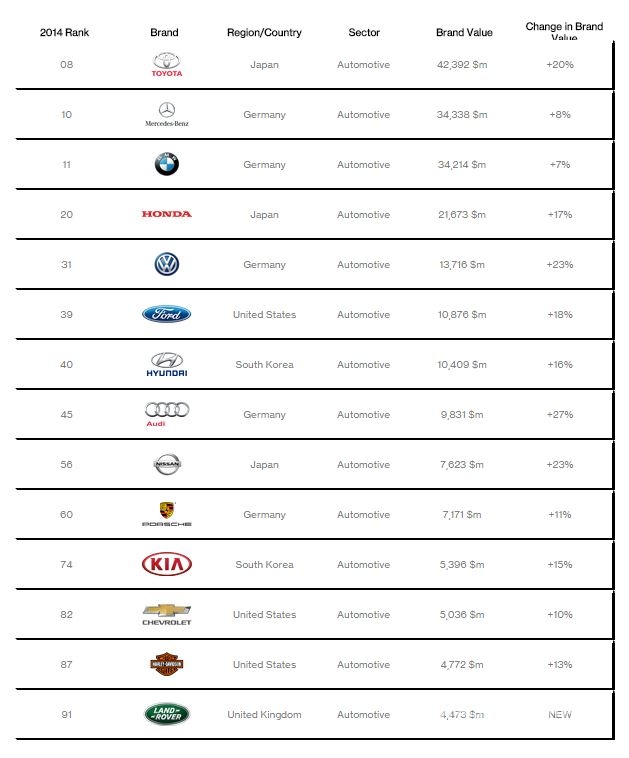 전체 순위에 속한 자동차 브랜드는 총 14개 업체로 도요타는 8위를 차지해 작년 대비 2단계 뛰어올랐고, 메르세데스-벤츠는 10위를 기록, 처음으로 브랜드 가치 탑10에 포함됐다. BMW는 1단계 오른 11위를 차지했다. 이 세 브랜드는 작년에 이어 자동차 업계 부동의 1~3위를 굳건히 지켰다.