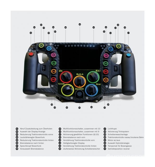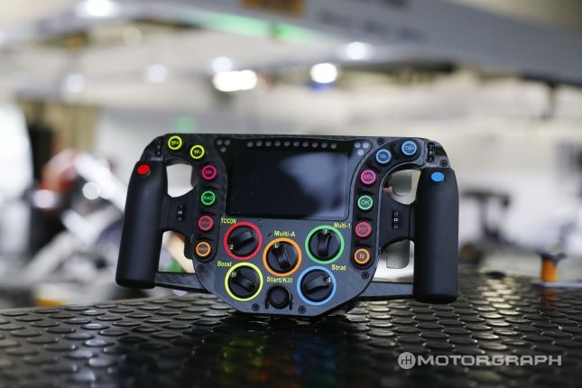 하단의 오렌지색 버튼 중 좌측에 위치한 버튼은 드링킹 시스템 조적을 담당하며, 우측 버튼은 기어 중립 기능이 있다. 좌측 하단 빨간 버튼은 윈드 스크린 워셔액 분사 기능을 갖췄으며, 우측 하단 빨간 버튼은 피트 레인에서의 크루즈 컨트롤 기능을 한다.