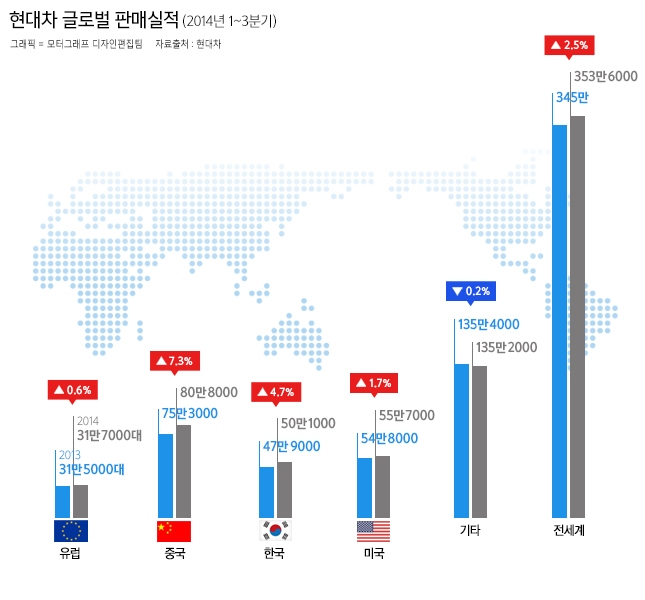 인도, 브라질, 러시아 등 기타 국가의 판매량이 작년보다 0.2% 하락했지만, 주요 국가별로 중국에서 80만8000대를 판매해 전년 대비 7.3% 늘어난 수치를 기록했으며, 국내는 50만1000대를 판매해 4.7% 증가된 판매량을 기록했다. 또, 미국에선 55만7000대의 차량을 판매해 전년 대비 1.7% 판매가 늘었으며, 유럽에서는 0.6% 늘어 31만7000대의 차량을 판매해 전제 판매 실적을 보면, 345만대 판매에 그친 작년보다 약 8만대 이상 늘어난 판매량을 나타냈다.