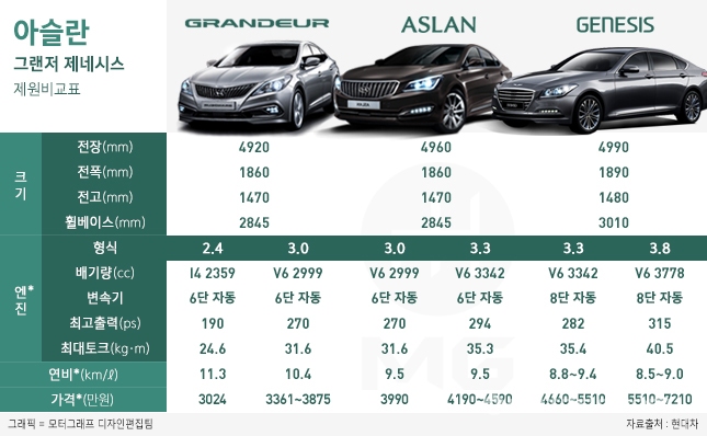 파워트레인은 3.0리터급과 3.3리터급을 적용해 그랜저와 제네시스의 딱 중간이다. 고급 세단 시장에 그랜저(2.4, 3.0), 아슬란(3.0, 3.3), 제네시스(3.3, 3.8), 에쿠스(3.8, 5.0)로 이어지는 고배기량 엔진 라인업이 완성된 것이다.
