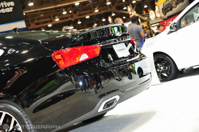 전시된 쉐보레 임팔라 블랙아웃 콘셉트(Impala Blackout Concept). 쉐보레는 "임팔라는 어떤 외관 색상을 적용해도 특유의 디자인 특징을 잘 보여준다"며 "임팔라 블랙아웃 콘셉트는 마치 스텔스처럼 꾸며졌다"고 설명했다. '블랙'을 테마로 외관과 실내가 꾸며졌다. 외관 일부에만 크롬을 적용해 존재감을 높였다.