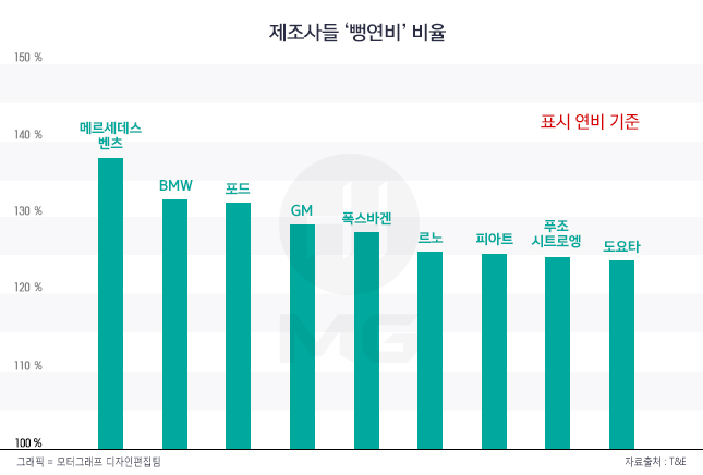 T&E 발표에 따르면, 연비 과장이 가장 심한 브랜드는 다임러(메르세데스-벤츠)였다. 다임러는 무려 표시 연비가 실제 주행 연비보다 38%나 과장됐다. 한 마디로, 다임러는 100km를 주행하는데 10리터의 연료가 필요하다고 밝혔지만, 실제 주행을 하면 13.8리터의 연료가 소모된다는 것이다.