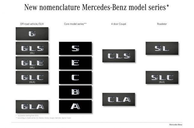 새로운 작명법은 메르세데스-벤츠의 주력 차종을 중심에 세웠다. 모든 차종의 이름은 세그먼트로 구분되는 A, B, C, E, S 등을 기본으로 한다. 이에 따라 GLK, M, GL 등 제각각이던 SUV의 이름은 큰폭으로 변경된다. 기존 GLK는 GLC, M은 GLE, GL은 GLS로 이름이 변경된다.