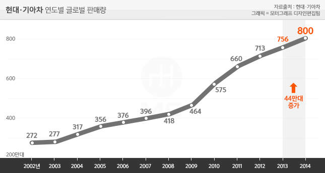 현대기아차는 올해 글로벌 판매 800만대 돌파가 확실시된다고 24일 밝혔다. 이는 지난해 판매량(756만대)에 비해 44만대 증가한 수치다.