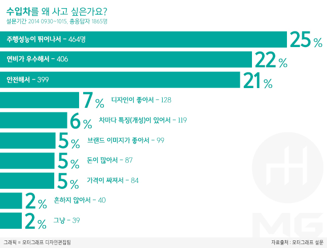 전체 응답자의 68%는 주행성능과 연비, 안전성 등 기술적 부분이 더 우수하기 때문에 수입차를 사고 싶다고 답했다. 세부적으로는 '주행성능이 뛰어나서'가 25%(464명)로 가장 많았고, '연비가 우수해서(22%, 406명)'와 '안전해서(21%, 399명)'의 순이었다.