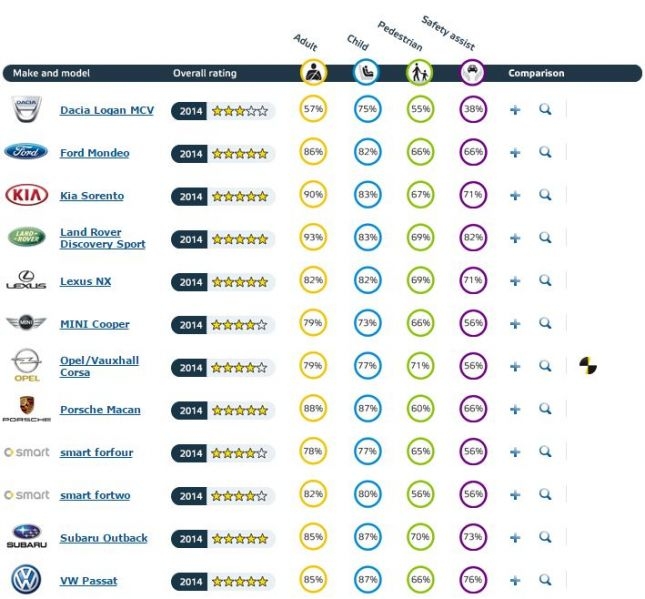 이번 충돌테스트는 랜드로버 디스커버리 스포츠, 기아차 쏘렌토, 포르쉐 마칸, 렉서스 NX 등 신차 총 12개를 대상으로 실시했다. 평가 결과 랜드로버 디스커버리가 종합점수 85.1점을 기록해 가장 안전한 차로 기록됐으며, 기아차 쏘렌토(82.1점)와 스바루 아웃백(81.2점)이 각각 2위, 3위를 차지했다. 최근 유럽 판매를 시작한 폭스바겐 신형 파사트(80.7점)와 포르쉐 마칸(80점)이 뒤를 이었고, 포드 몬데오(79.2점)와 렉서스 NX(78.3점)가 6위와 7위를 기록해 총 7종의 차종이 최고등급인 별 5개를 받았다.