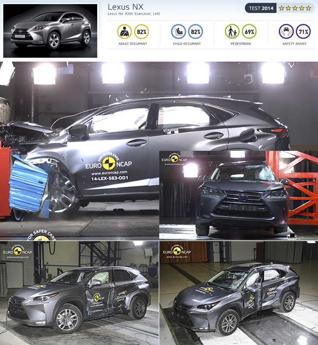 렉서스 NX는 성인보호 82%, 유아보호 82%, 보행자보호 69%, 안전장비 71%를 기록해 종합점수 78.3점을 받았다. 렉서스 RX 아랫급 콤팩트 SUV로 아우디 Q5보다 작고, 폭스바겐 티구안보다 크다. 하이브리드 모델인 NX300h는 2.5리터 앳킨슨 가솔린 엔진과 전기모터가 탑재됐으며, 이 모델은 지난 10월 국내에도 출시됐다. 내년엔 가솔린 터보 모델인 NX200t가 출시될 예정이다. 테스트 모델은 하이브리드 모델인 NX300h다.