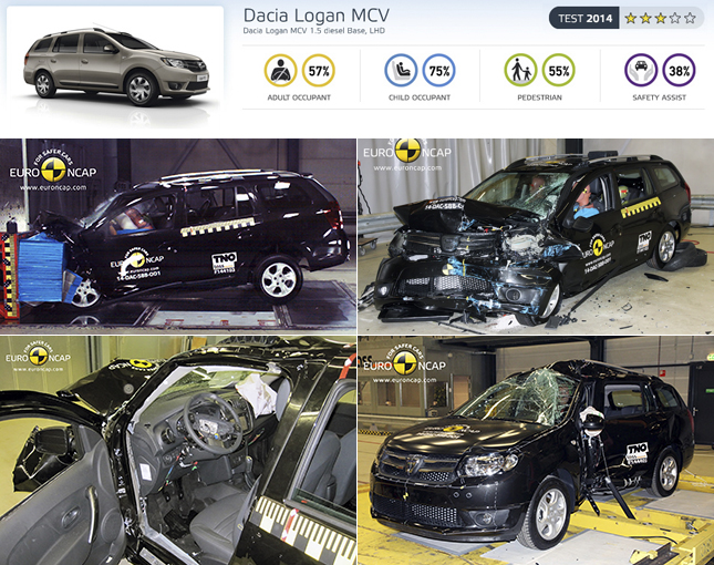 로간 MCV는 소형차 로간의 웨건형 모델로, 르노 계열의 루마니아 브랜드 다치아가 내놓은 차다. 이번 테스트에서 성인보호 57%, 유아보호 75%, 보행자보호 55%, 안전장치 38% 등의 점수를 받아 종합 58.3점을 기록했다. 함께 공개된 다른 차종에 비해 저조한 평가를 받았다. 특히, 안전 사양이 부족했으며, 성인 탑승자의 안전도가 크게 떨어졌다. 테스트카는 1.6 디젤 기본 모델이다.