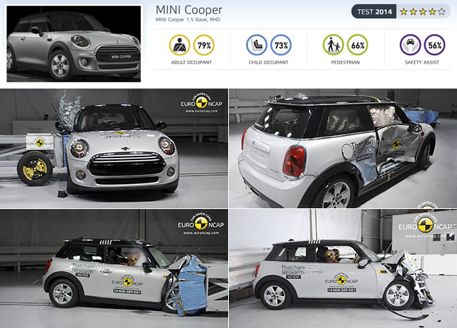 올해 출시된 신형 미니 쿠퍼는 성인보호 79%, 유아보호 73%, 보행자보호 66%, 안전장치 56%를 기록해, 종합점수 72.9점을 받아 최고등급에 못미치는 별 4개를 기록했다. 2007년 충돌테스트에서 구형 미니 쿠퍼는 성인 탑승자 안전도는 최고등급인 별 5개를 받았지만, 유아 탑승시 안전도는 별 3개, 보행자 안전도는 별 2개(최고등급 별4개)를 획득했으며, 당시엔 안전장치 관련 평가 점수는 없었다. 테스트 모델은 1.5 기본 모델이다.