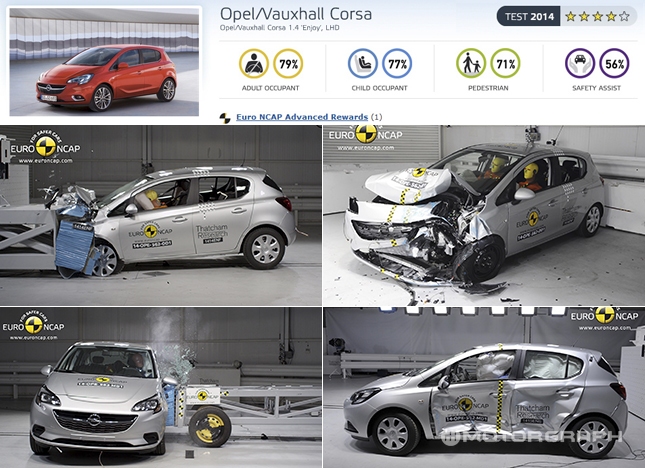 코르사는 독일 오펠이 만든 소형 해치백으로, 국내 소비자들에겐 생소하지만, 최근 출시된 신형이 5세대에 해당되는 브랜드 대표 모델이다. 이 차는 이번 테스트에서 성인보호, 79%, 유아보호 77%, 보행자보호 71%, 안전장치 56%를 기록해 종합점수 74.7점을 받았다. 테스트 차량은 1.4 엔조이 모델 좌핸들 버전이다. 이번 테스트에서 4개의 별을 획득한 차들 중 가장 우수한 안전도를 기록했다.