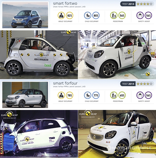 초소형 자동차 스마트 포투와 포포가 모두 안전도 별 4개를 기록했다. 미세한 차이로 2인승 모델인 포투가 4도어의 포포를 앞섰다. 포투는 성인보호 82%, 유아보호 80%, 보행자보호 56%, 안전장치 56%를 기록해 종합 73.8점을 기록했으며, 포포는 보행자보호 점수를 제외한 모든 항목의 수치가 포투와 같거나 낮았다. 차체는 4톤의 무게도 견딜 수 있다는 ‘트리디온 세이프티 셀’ 구조가 적용됐고, 초고장력 강판의 비율을 높였다. 테스트카는 999cc 패션 트림, 좌핸들 모델이다.