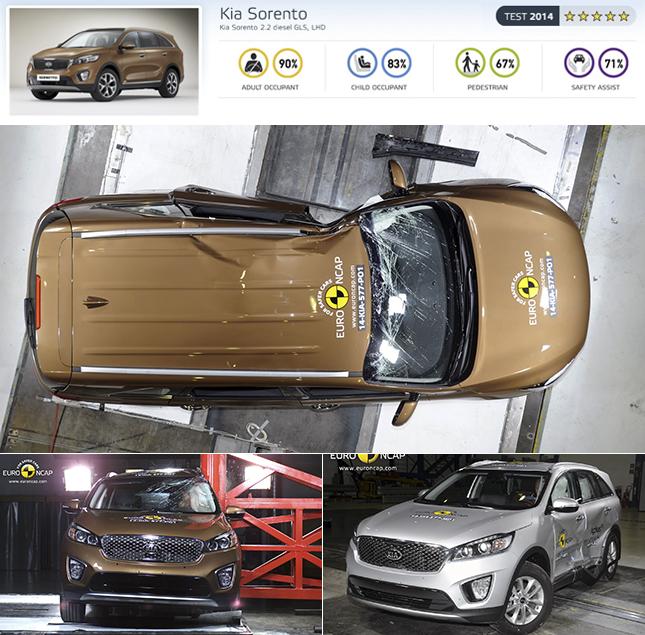 기아차 쏘렌토는 2009년형 구형 쏘렌토R에 이어 이번 테스트에서도 별 5개, 최고등급을 획득했다. 성인보호 90%, 유아보호 83%, 보행자보호 67%, 안전장비 71%의 점수를 기록해 종합 82.1점을 받았으며, 지난번 테스트 결과(87%, 84%, 44%, 71%, 종합 76.2점)와 비교해 보행자보호 점수가 크게 향상됐고, 성인 탑승자의 안전도도 소폭 올랐다. 다만, 안전장비 점수는 동일한 점수가 유지돼 큰 발전이 없는 것으로 평가됐고, 유아 탑승자에 대한 안전도는 하락했다. 테스트카는 2.2 디젤 GLS 모델, 좌핸들 버전이다.