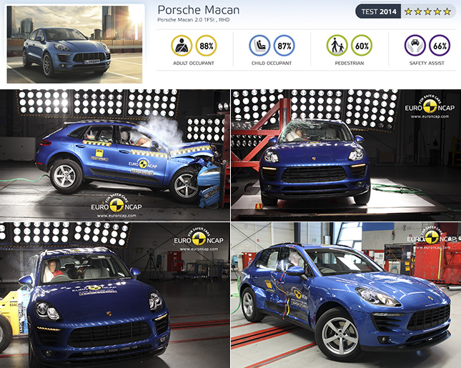 포르쉐 카이엔의 동생 마칸은 성인보호 88%, 유아보호 87%, 보행자보호 60%, 안전장비 66%를 기록해 종합 80점을 획득했다. 이 차는 폭스바겐의 MLB 플랫폼을 기반하며, 아우디 Q5와 섀시, 서스펜션을 공유한다. 포르쉐 최초로 2.0리터 4기통 엔진이 장착돼 화제가 됐으며, 테스트 차량도 2.0 모델이다. 지난 4월, 스웨덴 매체가 실시한 무스 테스트에서 저조한 결과를 보인 마칸이 안전도는 최고등급을 받았다.