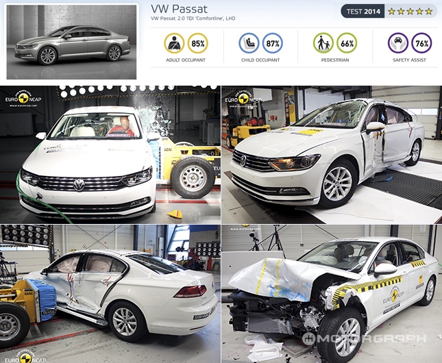 세련된 외관 디자인과 고급스러워진 실내를 갖춰 국내외 관심이 뜨거운 폭스바겐 신형 파사트는 성인보호 85%, 유아보호 87%, 보행자보호 66%, 안전장비 76% 등 종합점수 80.7점을 획득해 최고등급을 기록했다. 하지만, 2010년 실시된 테스트 결과(91%, 77%, 54%, 71%, 종합 78.8점)에 비해 성인 탑승자 안전도는 하락했다. 테스트카는 2.0 TDI 컴포트라인 좌핸들 모델이다.