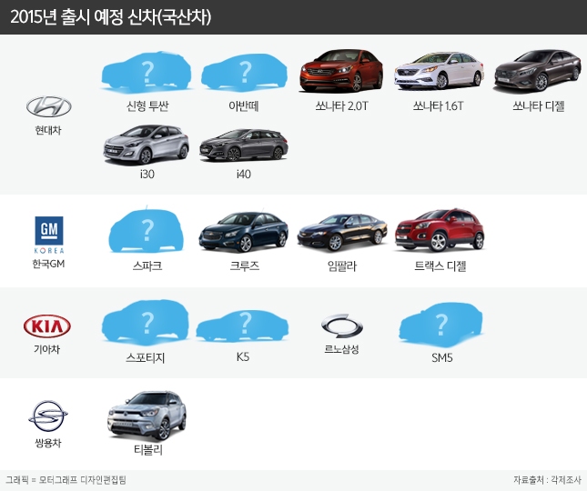 현대차는 베스트셀링카인 아반떼와 투싼의 풀체인지 모델을 출시하며, 부진을 겪고 있는 LF쏘나타에 터보와 디젤, DCT 모델을 추가해 반전을 노린다. 기아차 역시 신형 스포티지와 K5를 통해 떨어진 판매량을 끌어올린다는 계획이며, 한국GM도 신형 스파크와 트랙스 디젤, 크루즈 페이스리프트 등을 출시해 점유율 상승을 노린다. 또, 르노삼성은 SM5 페이스리프트를, 쌍용차는 1월 티볼리 가솔린 모델을 시작으로 디젤과 사륜구동, 롱바디 모델을 추가할 예정이다.