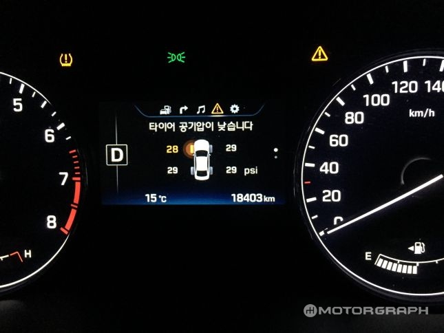 여느 때와 같이 회사차 현대 제네시스를 몰고 나가려는데 TPMS, 즉 타이어 압력 경고등이 들어온다. 기온이 많이 내려가서 공기압력이 부족하다고 경고한 것이다. 많은 수치는 아니고 약 15% 정도 부족하다는 경고다. 당장 차에서 내려서 공기압을 보충했다. 바로 이때가 가장 위험한 순간이기 때문이다.