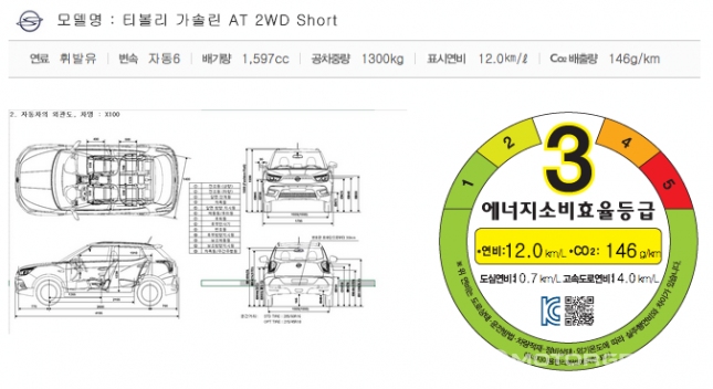 3일, 에너지관리공단에 따르면 티볼리 가솔린 모델의 복합 연비는 12.0km/l(도심 10.7km/l, 고속 14.0km/l)다. 수동변속기 모델은 12.3km/l다.