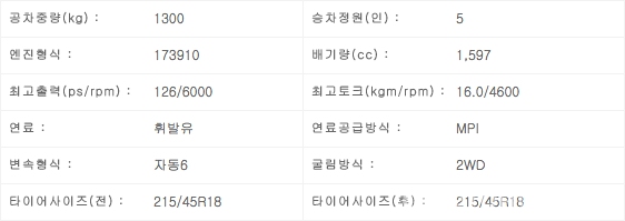 연비와 함께 공개된 엔진 성능은 최고출력 126마력(6000rpm), 최대토크는 16.0kg.m(4600rpm)이며, 차체 무게는 1300kg이다.