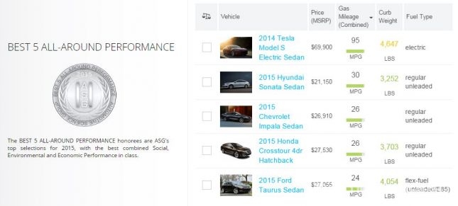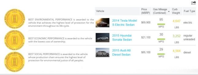 이밖에, 오토모티브 사이언스 그룹이 제조, 소비, 폐기 등 라이프 사이클 전 과정의 친환경성을 평가하는 최고 친환경차에는 전기차 테슬라 모델S가 선정됐고, 제조 과정에서의 환경 유해성을 평가하는 최고 사회적인 차에는 아우디 A8 디젤이 1위를 차지했다.