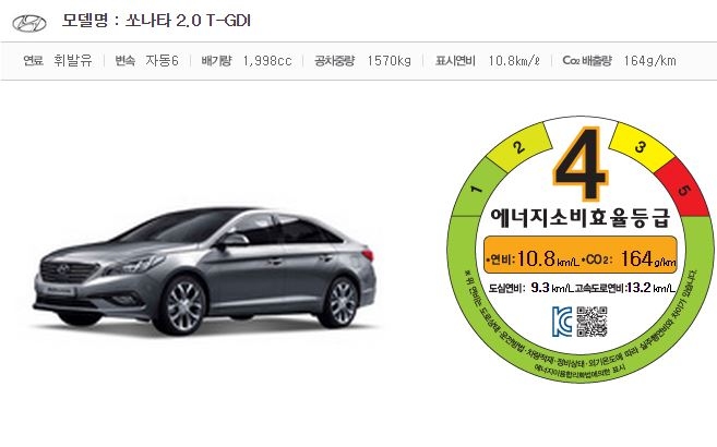 7단 듀얼클러치변속기(DCT)가 장착되지는 않았지만, 연비도 4.9%가량 좋아졌다. 6단 자동변속기가 탑재된 LF쏘나타 터보의 표시 연비는 도심 9.3km/l와 고속 13.2km/l를 포함해 복합 10.8km/l다. 이전 모델(10.3km/l)보다 조금 향상된 것인데, 공차중량(1570kg)이 50kg 무거워진 것을 감안하면 파워트레인 세팅 변경으로 인한 연비 향상 효과는 더욱 큰 것으로 보인다.