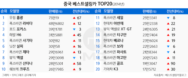 차종별 순위에서는 GM과 중국 우링자동차가 합작해 만든 MPV 모델인 '우링 홍광'이 1위를 차지했다. 홍광은 2013년에도 42% 증가한 44만8484대가 판매됐는데, 작년에는 이보다 무려 67% 늘어난 75만19대가 판매되는 등 더욱 가파른 상승세를 이어갔다.