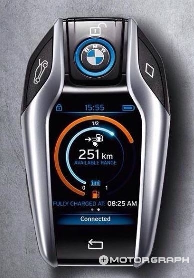자동차키도 특이하다. i8의 스마트키 아주까리 오일(castor bean oil)과 유리섬유를 이용한 친환경 소재로 만들어졌는데, 고해상도의 LCD 화면이 장착돼 차량의 배터리팩 충전 상태와 주행 가능 거리를 알려주며, 에어컨 등을 미리 켤 수 있는 등 다양한 기능이 내장됐다. 또, 아이폰과 비슷한 인터페이스로 하단부에 홈 버튼이 있으며, 터치 방식으로 각 기능을 사용할 수 있다.